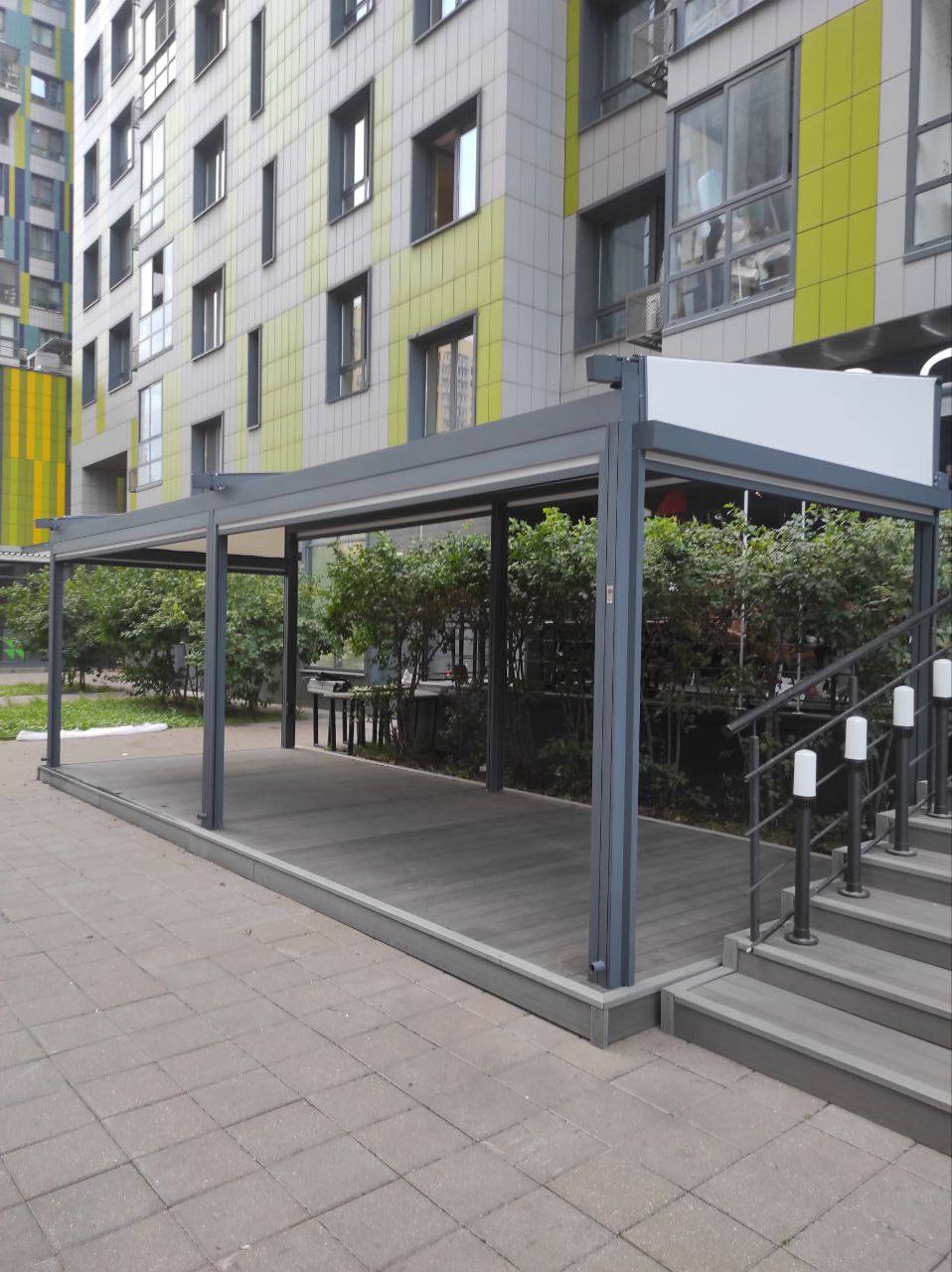 Биоклиматическая пергола с поворотными ламелями на подиуме